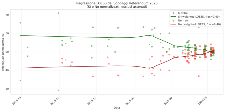 “Grafico weighted LOESS dei sondaggi sul referendum costituzionale italiano 2026 (separazione delle carriere nella magistratura). Curve Sì/No normalizzate (esclusi indecisi), punti pesati per dimensione campione.”