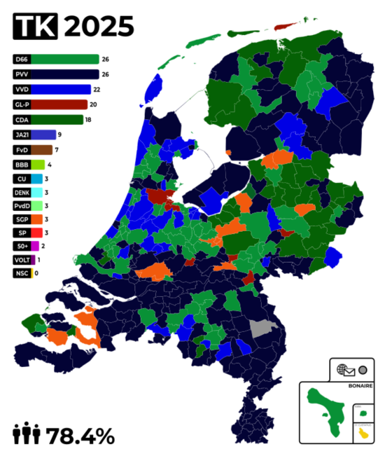 Con il 99,7% dei voti conteggiati, infatti, il divario tra il partito guidato dal trentottenne Rob Jetten e quello della guida della formazione populista olandese non può più essere colmato, garantendo così il primo posto nella corsa elettorale al D66 (e diciassette seggi in più rispetto alle elezioni poltiiche del 2023) e mettendo la parola fine ad un serrato testa a testa tra i due partiti, che ottengono 26 seggi ciascuno all’interno della prossima Camera dei Rappresentanti.