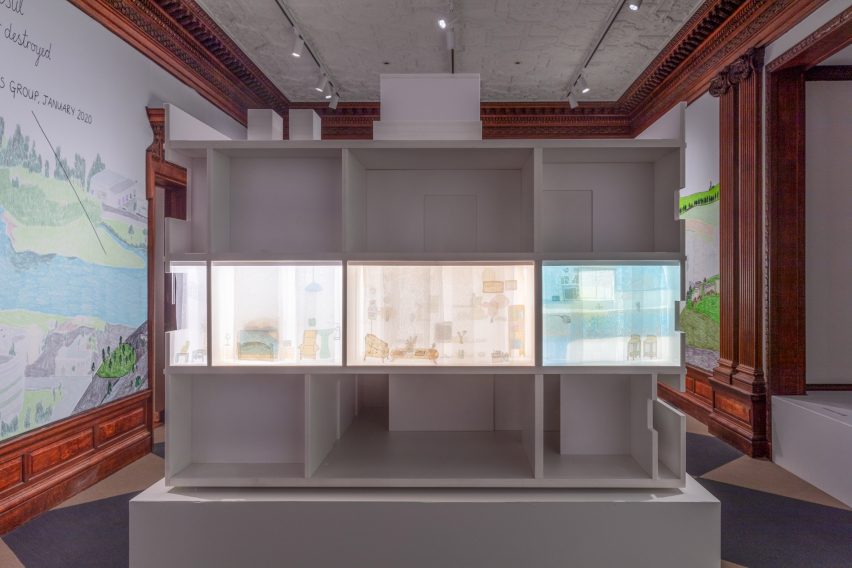 I modellini dell’installazione ricreano nei minimi dettagli tre case danneggiate o distrutte da conflitti: in Siria nel 2016, in Iraq nel 2015 e in Palestina nel 2023. In tutti e tre i casi, le abitazioni sono state distrutte da munizioni statunitensi. Nell’installazione sono state implementate anche fragranze che aiutino lo spettatore ad immergersi nel contesto privato ed emozionale di ogni singola casa: menta piperita in Siria, che richiama il tè, lavanda in Iraq per ricordare i giardini davanti le case e arancio in Palestina per rievocare i frutteti.